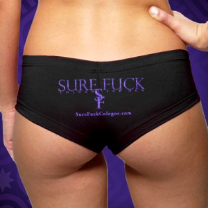Sure Fuck doesn’t discriminate by allowingt both guys and gals to offend the masses by proudly proclaiming their sexual availability; the clothing line includes both uni-sex t-shirts and booty shorts, featuring the Sure Fuck logo and motto, “Nothing’s for certain, but one thing’s for sure.”